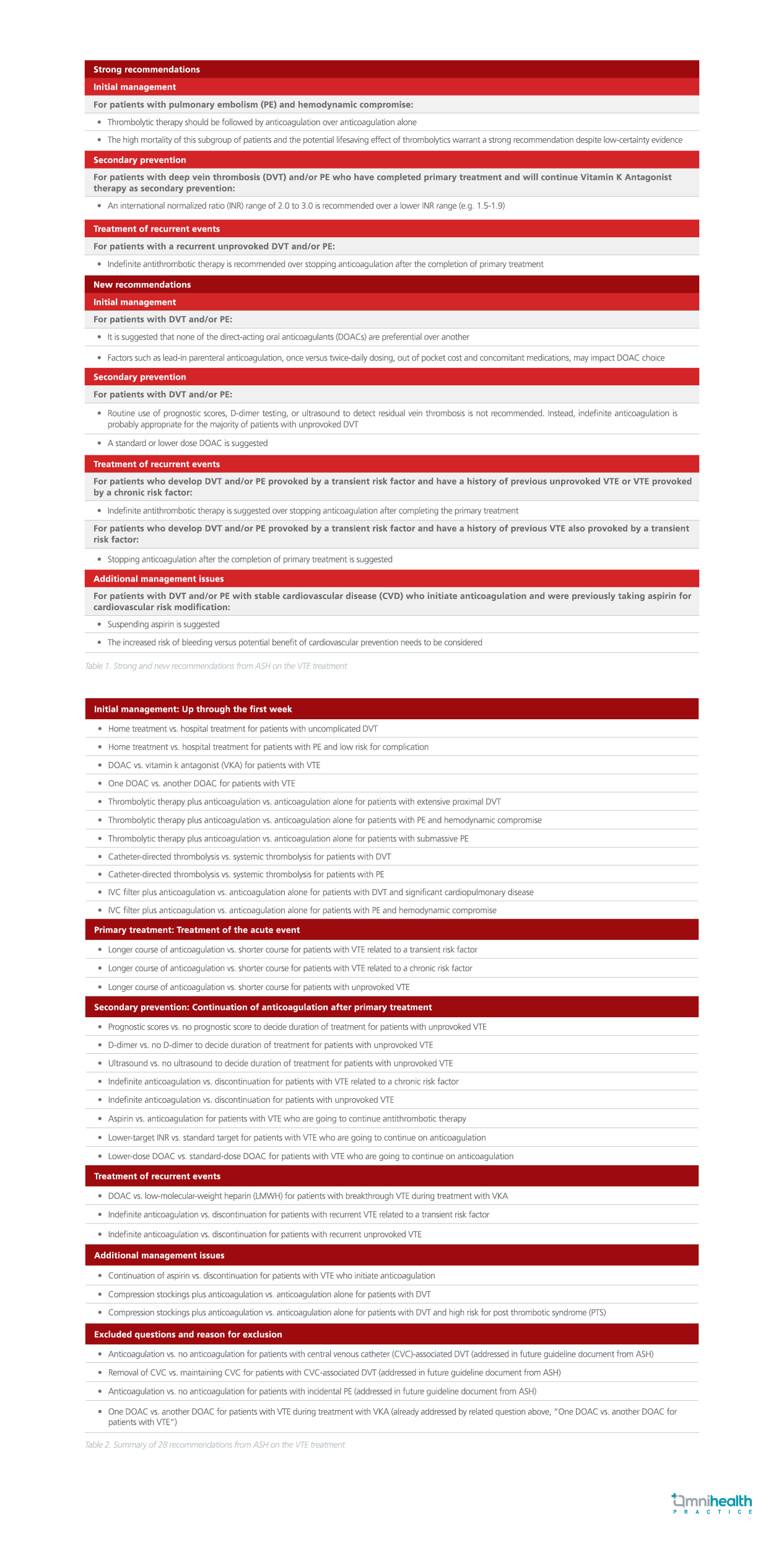 A multidisciplinary guideline panel from the American Society of Hematology (ASH), with support from the McMaster University Grading of Recommendations Assessment, Development and Evaluation (GRADE) Centre, has drafted a list of 28 recommendations for the initial venous thromboembolism (VTE) management, primary treatment, secondary prevention and the treatment of recurrent VTE events.1