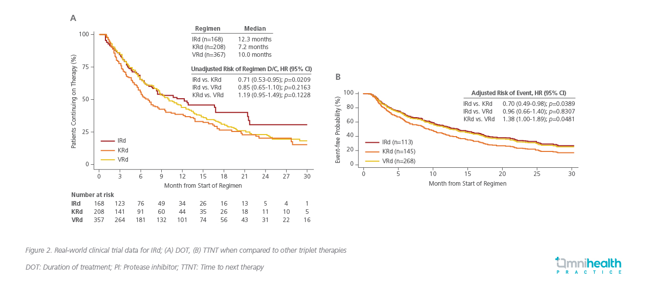 Compared to other triplet regimen such as KRd (carfilzomib, lenalidomide, dexamethasone) or VRd, the median duration of therapy (DOT) for the IRd regimen was shown to be comparatively longer at 12.3 months versus 10 months for VRd and 7.2 months for KRd (Figure 2A).21 Additionally, among those with intermediate risk such as frail patients, IRd was also associated with a longer TTNT when compared to other triplet regimen (Figure 2B).21 Prof. Jackson reiterated, “Evidence supports IRd as a probably easier to deliver regimen in the clinical setting for longer durations.”
