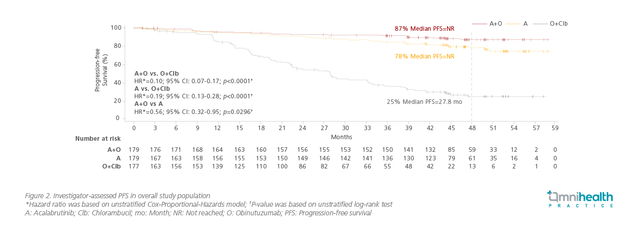 In addition to previously treated CLL patients, acalabrutinib is also approved for treatment-naïve CLL patients based on the results of the ELEVATE-TN trial which compared acalabrutinib to the conventional chemoimmunotherapy.5,13 Previously, early results from this pivotal global, phase 3, multicenter, open-label study at a median follow-up of 28.3 months showed superior efficacy of acalabrutinib with or without obinutuzumab (A±O) than obinutuzumab plus chlorambucil (O+Clb) in patients with treatment-naïve CLL and a median age of 70-years-old (n=535).13
