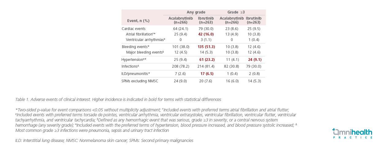 Dr. Byrd continued, “Non-inferiority studies typically demonstrated the benefit of acalabrutinib in other areas, lower frequencies of common AEs, grade ≥3 AEs, serious AEs, and treatment discontinuations due to AEs overall were observed with acalabrutinib in our study.” Notably, acalabrutinib was better tolerated than ibrutinib with statistically lower allgrade AF or flutter incidence (9.4% vs. 16.0%; p=0.02).12 Acalabrutinib also demonstrated superiority in the median onset time of AF or flutter (28.8 vs. 16.0 months) and AF- or flutter-related treatment discontinuation rate (0% vs. 16.7%).12 Among any-grade AEs of clinical interest, acalabrutinib was associated with a statistically lower (p<0.05) incidence of bleeding events, hypertension and interstitial lung disease (ILD) or pneumonitis when compared with ibrutinib, leading to treatment discontinuation in 14.7% and 21.3% of acalabrutinib-treated versus ibrutinib-treated patients, respectively (Table 1).12 With less common AEs observed, particularly the cardiovascular events, acalabrutinib is an equipotent and better tolerated BTK inhibitor as compared to ibrutinib for patients with previously treated CLL.12