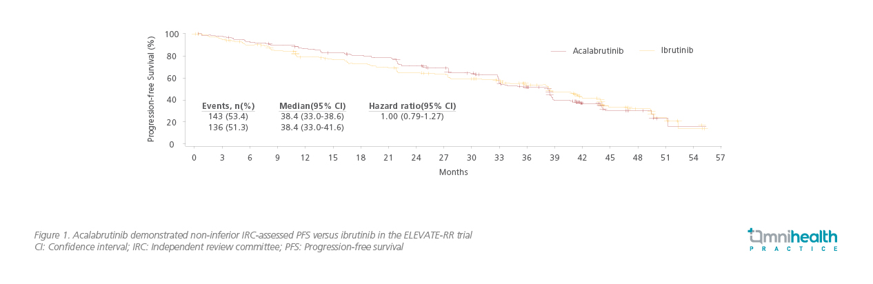 The resulting clinical difference, particularly intolerability, was demonstrated in ELEVATE-RR, the first head-to-head trial comparing the safety and efficacy of acalabrutinib and ibrutinib in patients with previously treated CLL and del(17p) or del(11q).12 This phase 3, randomized, non-inferiority, open-label trial recruited 533 patients (median age of 66-years-old) and stratified them into subgroups by del(17p) status, Eastern Cooperative Oncology Group performance status (ECOG PS) and number of prior therapies.12 The patients were then randomized to receive oral acalabrutinib 100mg twice daily (n=268) or ibrutinib 420mg once daily (n=265) until progression or unacceptable toxicity.12