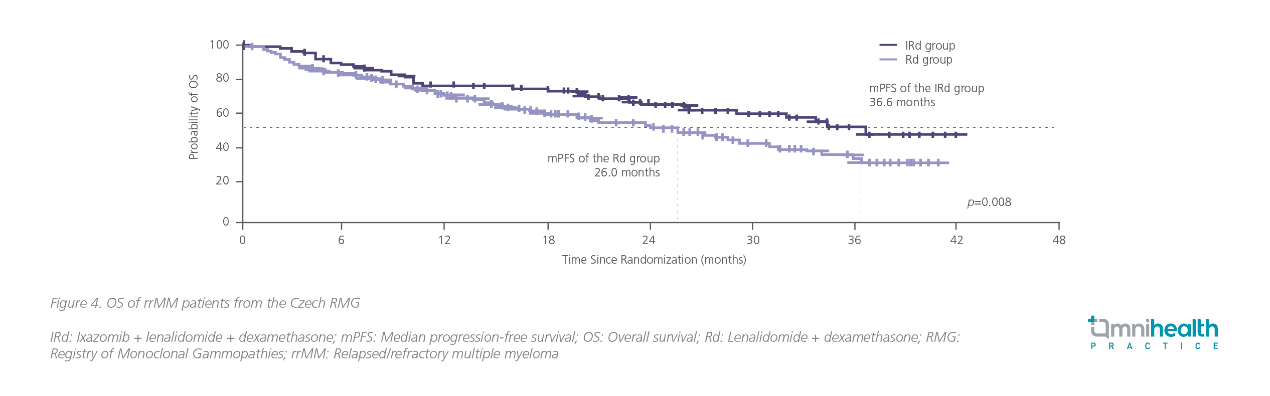The effectiveness of IRd was revealed in several multicenter, RW studies. The RW data drawn from the Czech Registry of Monoclonal Gammopathies (RMG) with a total of 344 patients being treated with IRd (n=127) or lenalidomide + dexamethasone (Rd) (n=217) showed an mPFS of 23.1 months with IRd vs. 11.6 months in the Rd group (HR=0.67; 95% CI: 0.51-0.89; p=0.006) for patients within relapse 1-3.4 The progression-free survival (PFS) advantage with IRd over Rd was translated into an improved overall survival (OS) of 36.6 months for patients treated with IRd vs. 26.0 months for patients treated with Rd (p=0.008) (figure 4).4