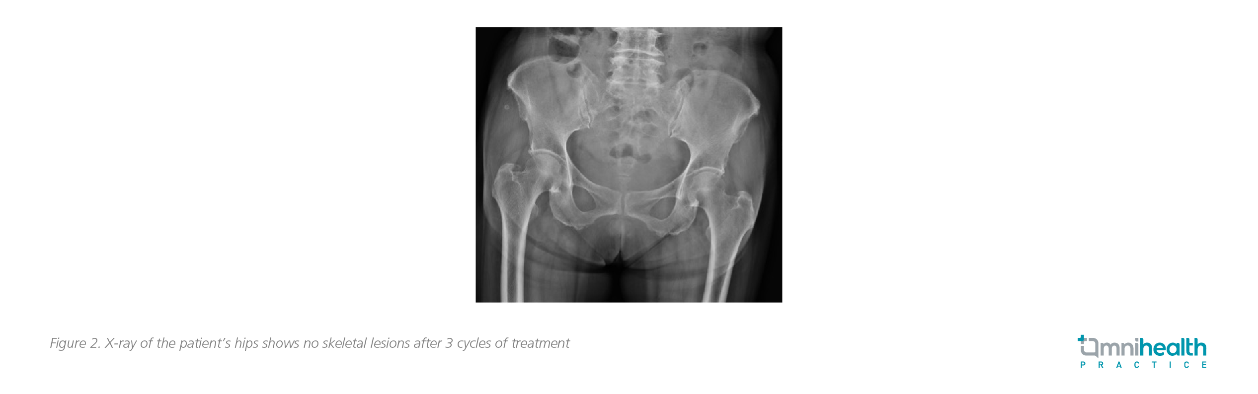 In 2017, the patient had a symptomatic relapse with the chief complaint of bone pain. Upon investigation, she was also found to have mild anemia with a hemoglobin (Hb) level of 10g/dL. She also had an elevated paraprotein level [Immunoglobulin G-κ (IgG-κ)] of 23g/L and presented with mild hypercalcemia at 2.65mmol/L. This constituted a biochemical relapse of MM, despite the patient’s normal renal function. Subsequently, she was switched from the Cy-dex regimen to the IRd regimen. High efficacy aside, the decision of switching the treatment to ixazomib was also based on the lower cardiovascular (CV) event risk associated with ixazomib since the patient had baseline CV comorbidities. In addition, ixazomib was the only oral therapy for MM management, and its convenience was believed to be particularly beneficial to patients with poor performance status.