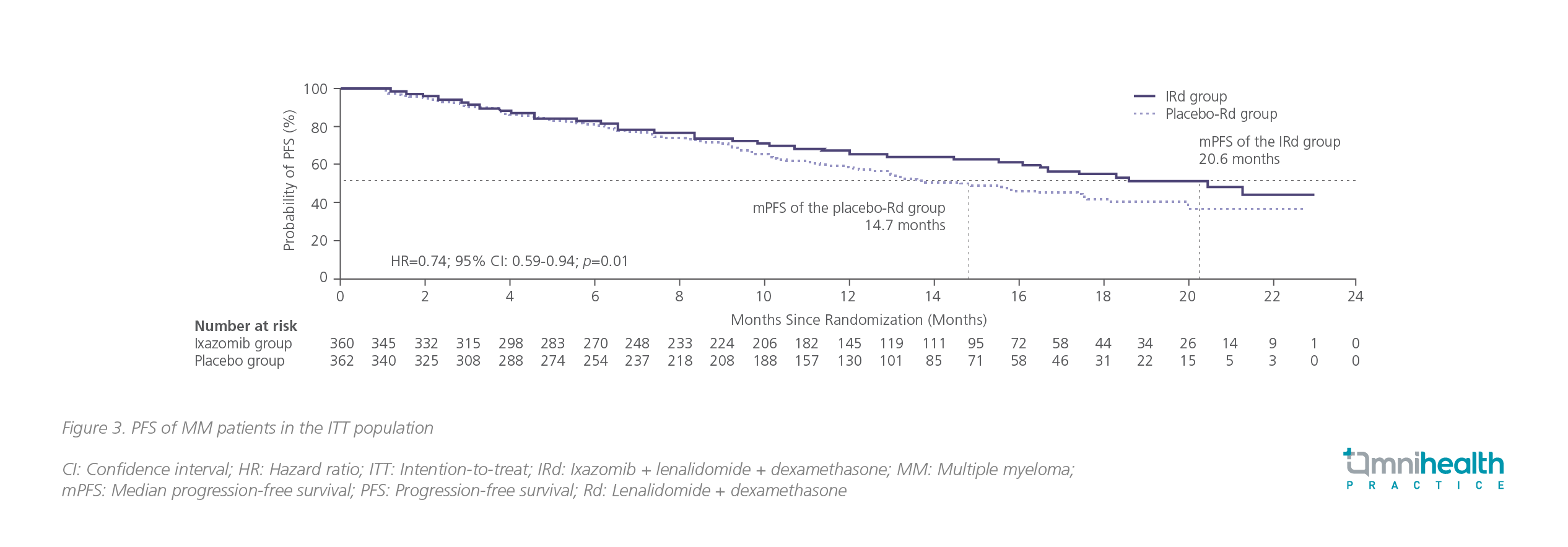 The primary endpoint was median progression-free survival (mPFS), in which the IRd group had a significant improvement of 35% over the placebo-Rd group (20.6 months vs. 14.7 months; HR=0.74; 95% CI: 0.59-0.94; p=0.01) with a median follow-up of 14.8 months in the ixazomib group (figure 3).2