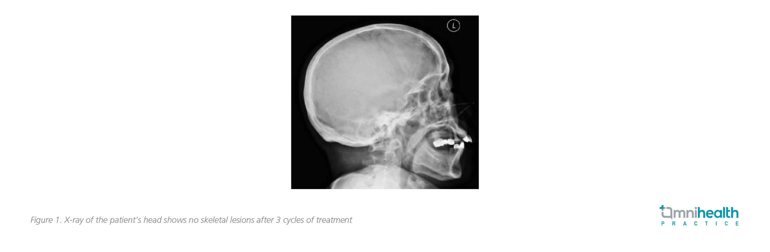 Then, the patient’s blood biochemical parameters returned to normal values soon after the initiation of IRd treatment. Her anemia was resolved with the Hb level normalizing to 12g/dL, and the blood calcium levels returning to within the normal range. The IgG-κ levels also dropped to <3g/L after 3 cycles of IRd regimen. In addition, a skeletal survey was performed, with no detection of lytic bone lesion (figure 1 and 2). Her chief complaint of bone pain was completely resolved after a few months of IRd treatment.
