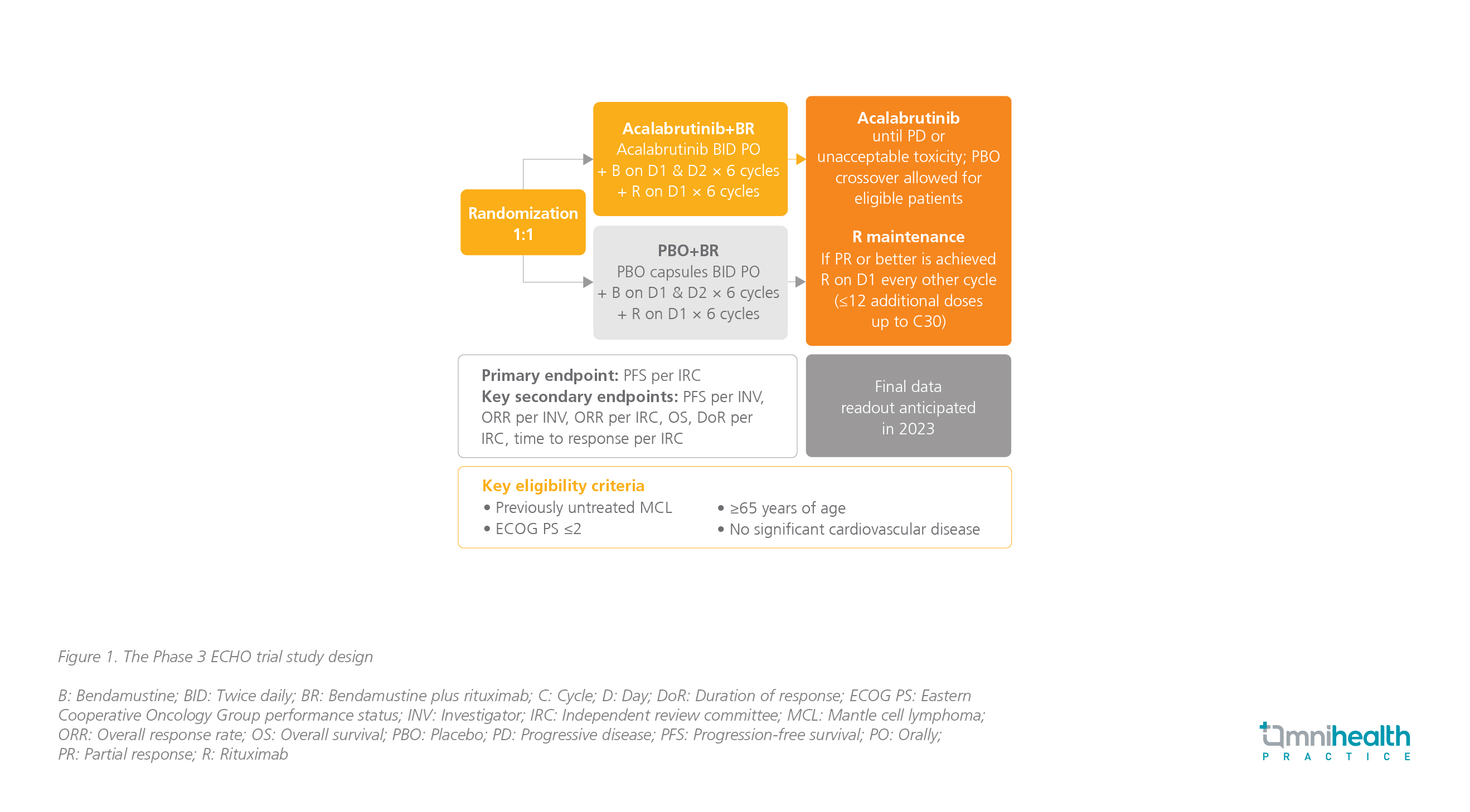 Besides, utilizing the combination of BTKis and chemoimmunotherapy for managing treatment-naïve MCL holds another great promise. The ECHO trial is an ongoing phase 3 trial that compares acalabrutinib plus bendamustine and rituximab (BR) with placebo plus BR in treatmentnaïve MCL patients (figure 1). The primary endpoint is PFS, and other key secondary endpoints are overall response rate (ORR), OS, duration of response (DoR), and time to response. Based on the previous experiences with acalabrutinib, Prof. Rule expected that patients in this study will remain on acalabrutinib longer when compared with ibrutinib, probably due to better safety, and he anticipated to have positive results from this study by next year.