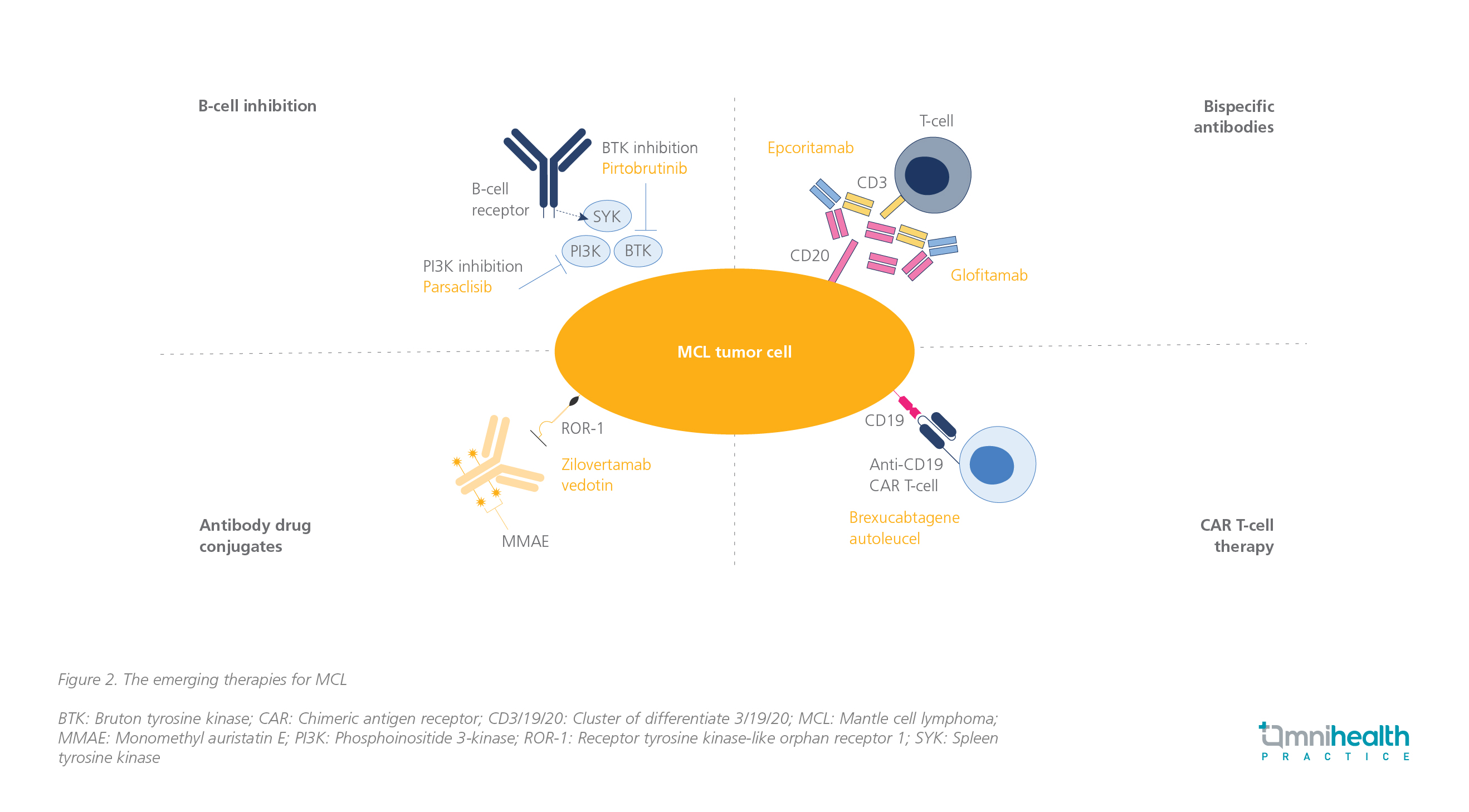 As an alternative to chemotherapy, researchers are now exploring emerging therapies for treating MCL including B-cell inhibition, bispecific antibodies, antibody-drug conjugates, and chimeric antigen receptor (CAR) T-cell therapy (figure 2).14 According to Prof. Rule, ongoing clinical trials (e.g., the ENRICH study, the MANGROVE study) are underway to investigate the potential of BTKi and B-cell lymphoma 2 protein (BCL-2) inhibitor combinations as an effective treatment for MCL.