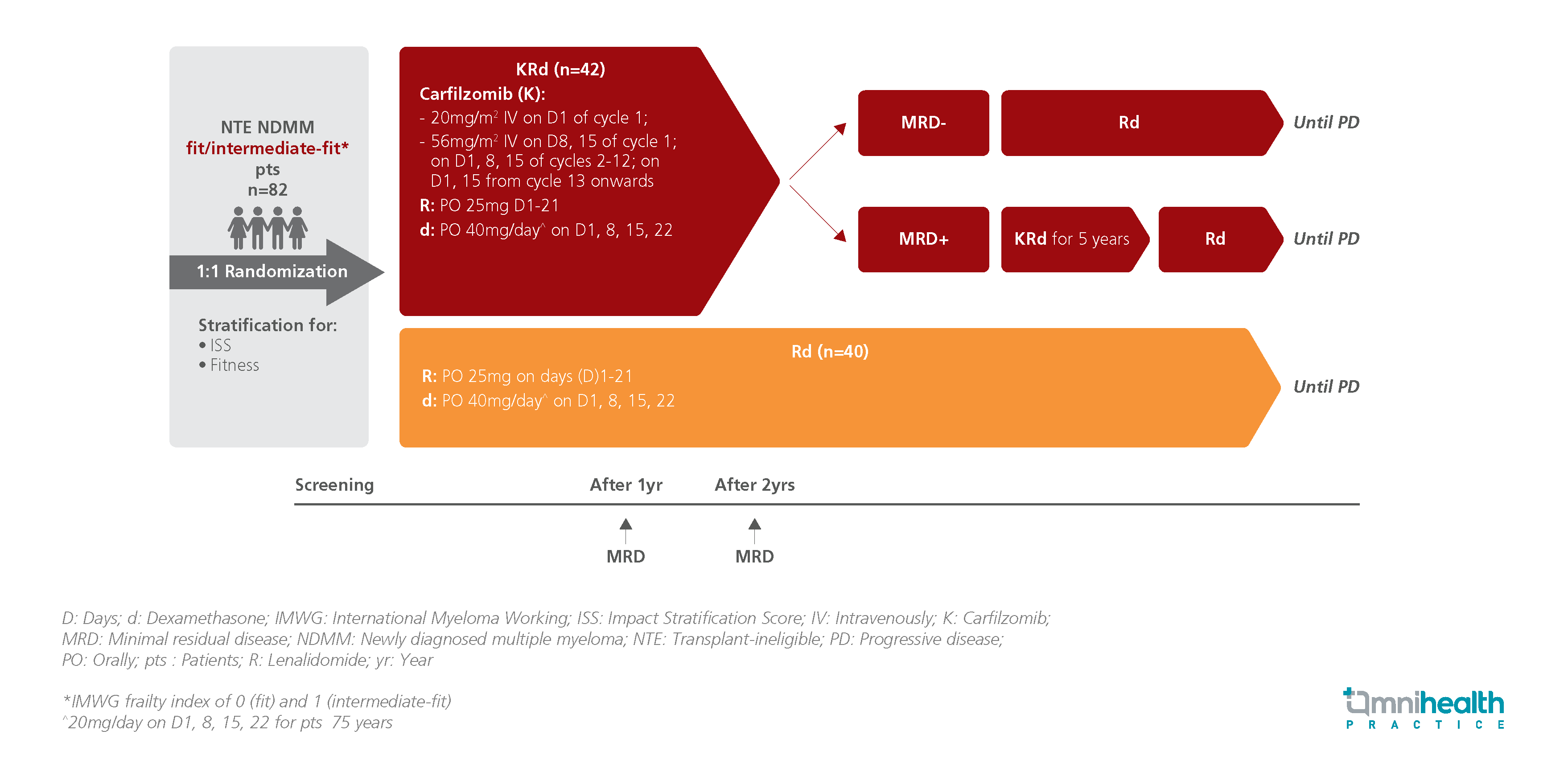 The EMN20 trial was a multicenter, randomized, phase 3 trial that evaluated the clinical efficacy of the 3-drug regimen of carfilzomib plus lenalidomide-dexamethasone (KRd) compared to the Rd regimen in treating NTE NFMM fit to intermediate-fit patients.1 A total of 82 patients were enrolled and randomized to receive either KRd (n=42) or Rd (n=40) until disease progression.1 After 2 years of treatment, patients from the KRd arm who achieved minimal residual disease (MRD) negativity were switched to Rd alone while those that showed MRD positivity continued KRd for 5 years.1 The protocol was halted in Nov 2021, following the introduction of frontline daratumumab (Dara)-Rd.1