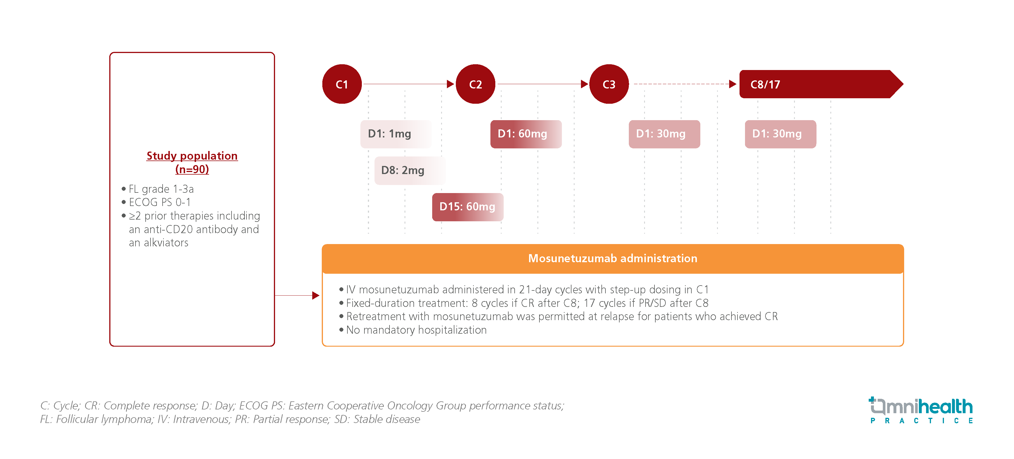 The pivotal phase II study was a single-arm study that investigated the efficacy and safety of mosunetuzumab among R/R FL patients pre-treated with ≥2 prior treatments.1 90 patients with R/R FL and ≥2 prior therapies, including an anti-CD20 antibody and an alkylator, were enrolled and were administered mosunetuzumab intravenously in 21-day cycles.1 Dosing was stepped up from 1mg to 60mg in cycle 1.1 All patients received 8 cycles of treatment, with those who showed partial response (PR) or stable disease (SD) continuing treatment until cycle 17.1 Retreatment was permitted at relapse for patients who achieved complete response (CR).1