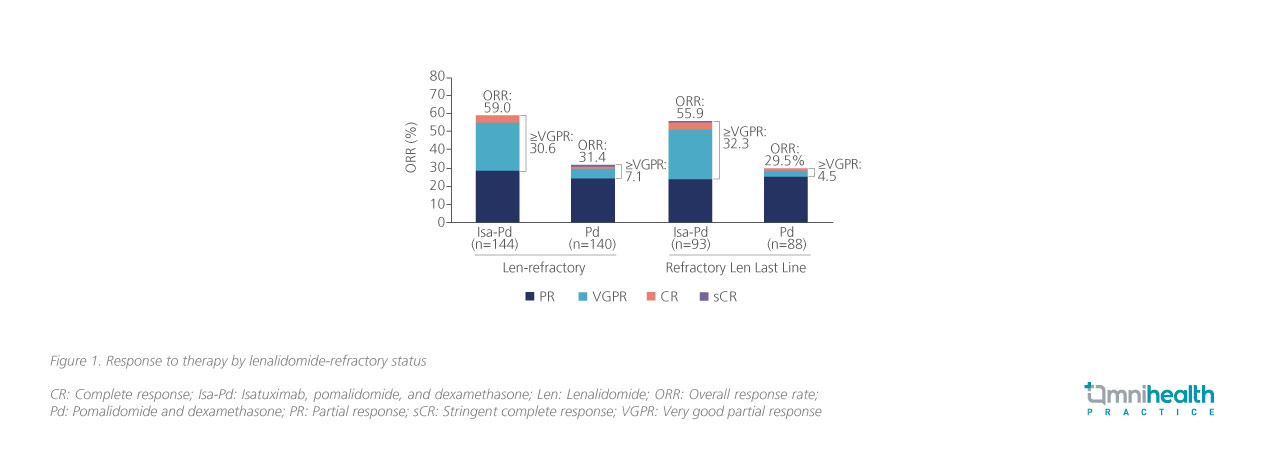At a median follow-up of 11.6 months, the median progression-free survival (PFS) of the Isa-Pd arm was significantly longer than that of the Pd-only arm, indicating an approximately 40% reduced risk of progression and death (11.5 vs. 6.5 months; HR=0.596; 95% CI: 0.44-0.81; p=0.001).1 In addition, the overall response rate (ORR) of the Isa-Pd arm was also significantly higher than that of the Pd-only arm (60% vs. 35%; OR=2.795; 95% CI: 1.75-4.56; p<0.0001).1 A subsequent subgroup analysis revealed that compared to the Pd-only arm, a higher ORR was observed in Isa-Pd arm among patients who were lenalidomide-refractory (59.0% vs. 31.4%) and those who were lenalidomide-refractory at last line (55.9% vs. 29.5%), with the proportion of patients who exhibited very good partial response (VGPR) maintained at 30.6% and 32.3% respectively (figure 1).5