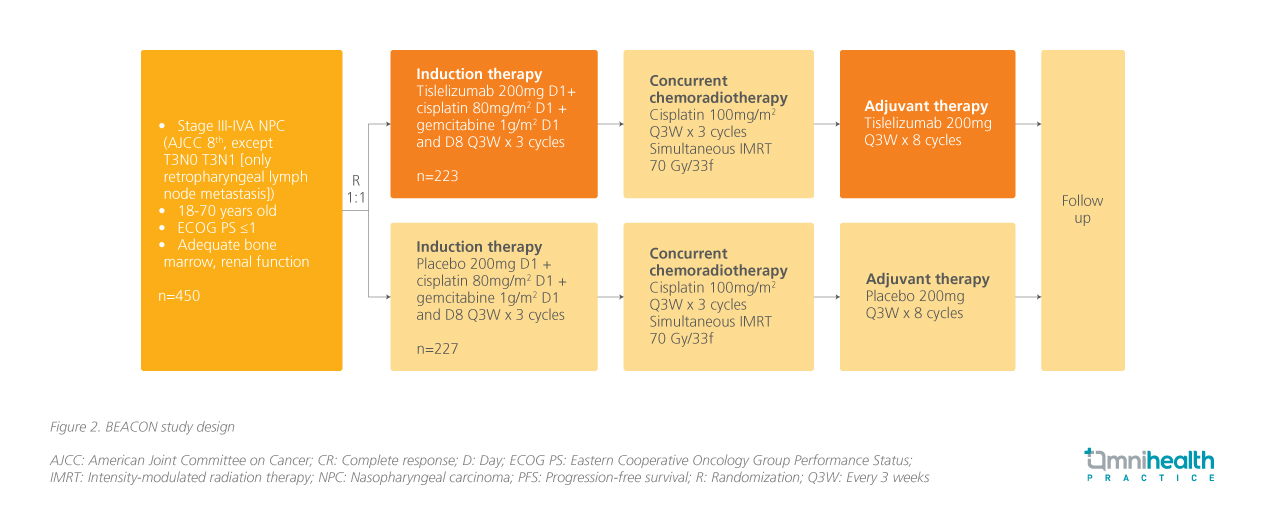 The BEACON study, a randomized double-blind phase 3 trial, aimed to evaluate the efficacy and safety of tislelizumab + GP for patients with LANPC (figure 2).3 The enrolled 450 patients with stage III-IVa NPC (excluding T3N0 and T3N1 with retropharyngeal lymph node metastasis) and involved a test group receiving tislelizumab + GP for three cycles, while the control group received a placebo + GP for the same duration.3 Following this, all participants received concurrent chemoradiotherapy (CCRT) with cisplatin for three cycles, followed by additional cycles of tislelizumab or placebo.3
