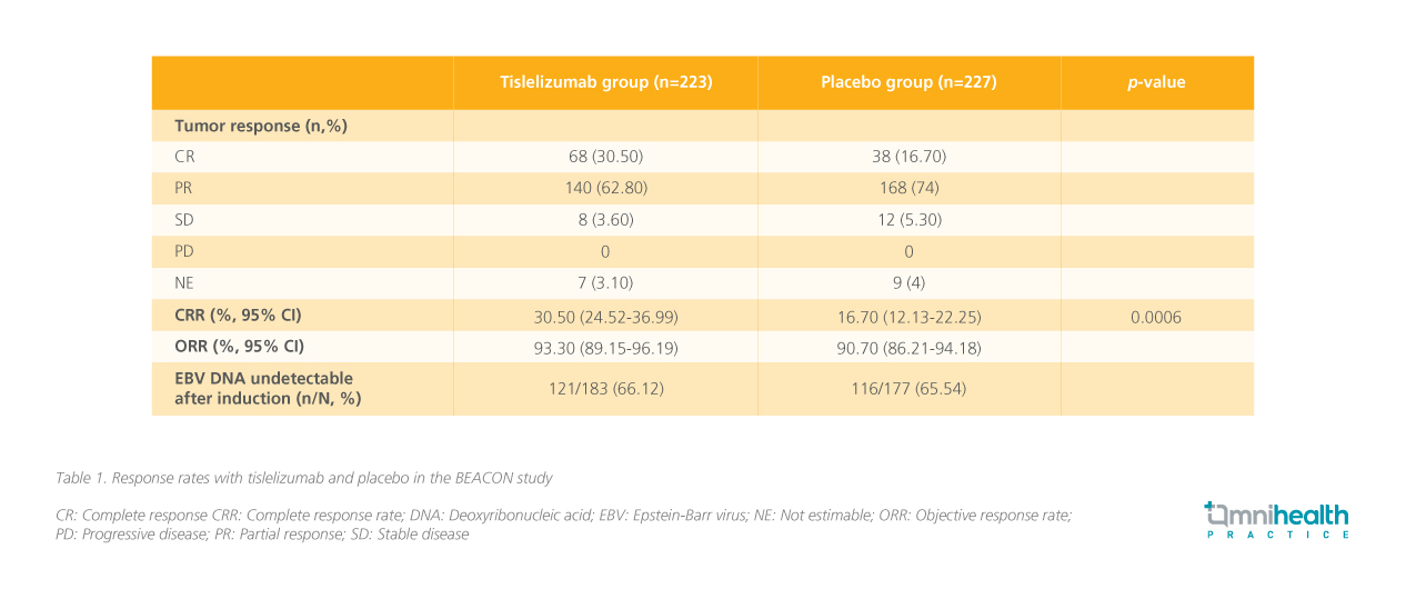 The primary endpoint was complete response rate (CRR) which was 30.50% in the tislelizumab group compared to 16.70% in the placebo group, while the overall response rate (ORR) was 93.3% vs. 90.7%, respectively (table 1).3