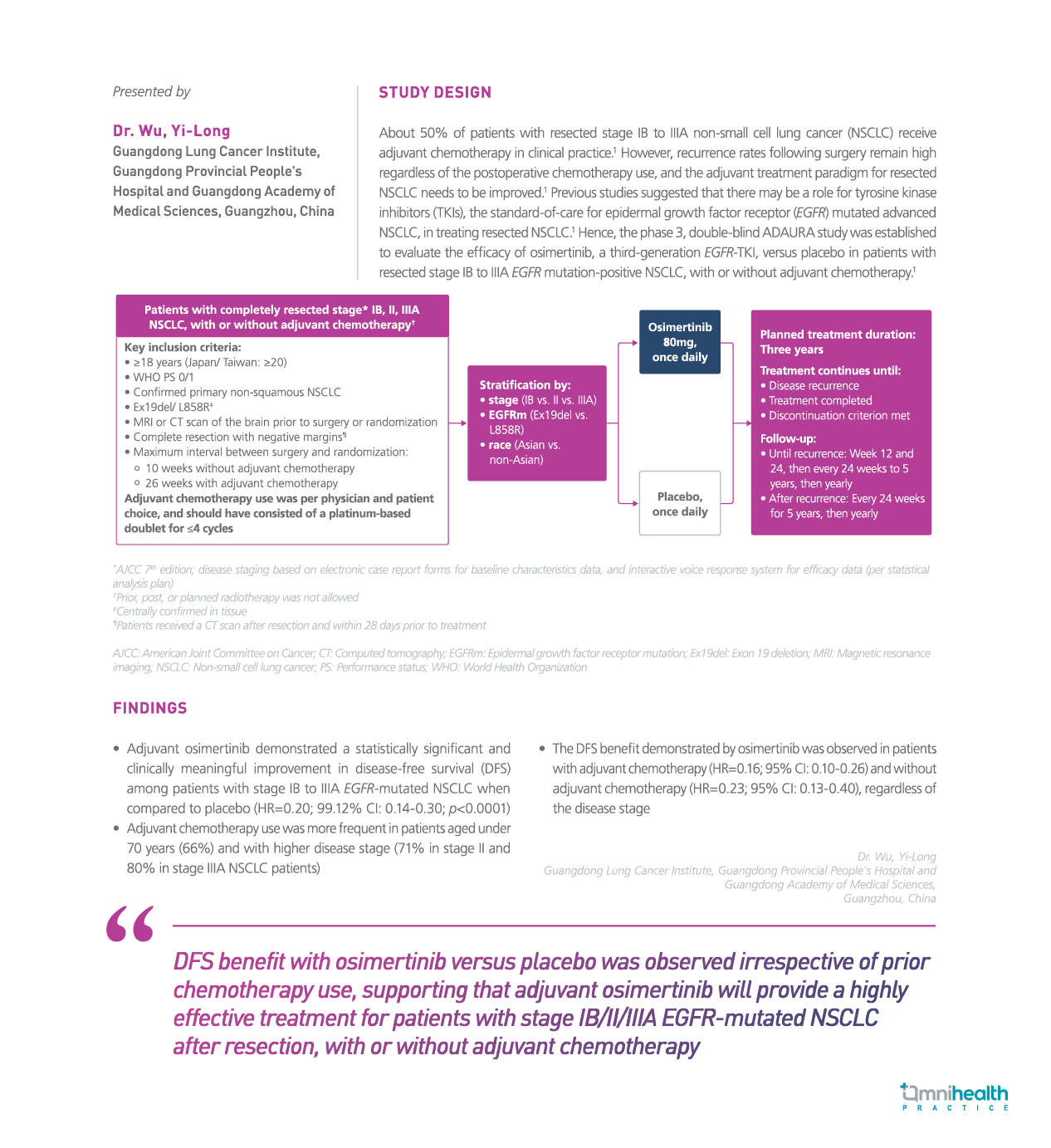 Osimertinib significantly improved disease-free survival in patients with resected EGFR-mutated non-small cell lung cancer, regardless of adjuvant chemotherapy use