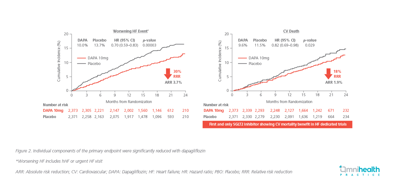 Furthermore, when analyzed separately, the individual components of the composite endpoint were significantly reduced with dapagliflozin (30% RRR in hospitalization for HF or urgent HF visits, 18% RRR for cardiovascular death) (Figure 2).10 A key secondary endpoint was death from any cause, which was significantly reduced by 17% (HR=0.83; 95% CI: 0.71-0.97) with dapagliflozin compared to placebo.10