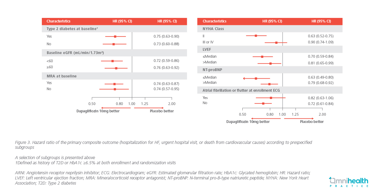The results of the DECLARE-TIMI 58 trial, which included 17,160 patients with type 2 diabetes and established atherosclerotic CVD or multiple risk factors for atherosclerotic CVD, showed that dapagliflozin resulted in a significantly lower rate of cardiovascular death or hospitalization for HF when compared to placebo after a median follow-up of 4.2 years (4.9% vs. 5.8%; HR=0.83; 95% CI: 0.73-0.95; p=0.005).8 In a further meta-analysis of SGLT2 inhibitor cardiovascular outcome trials, it was revealed that dapagliflozin has a consistent benefit in reducing the risk of hospitalization for HF in both patients that have atherosclerotic CVD (HR=0.83; 95% CI: 0.71-0.98) and those without (HR=0.84; 95%CI: 0.67-1.04).9 As 90% of the patients in the DECLARE-TIMI 58 trial did not have a history of HF at baseline, the treatment with dapagliflozin appeared to have a benefit in preventing new clinical HF from occurring among patients with type 2 diabetes.8