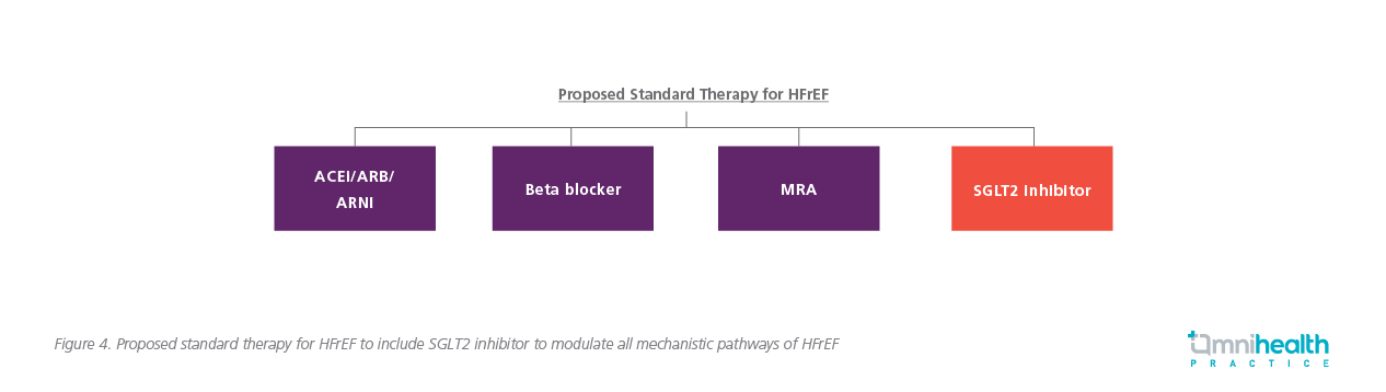 May 2020, dapagliflozin became the first SGLT2 inhibitor to be approved for the treatment of adults with HFrEF in the US.15 Shortly after, dapagliflozin was also approved in the European Union (EU) in November 2020 for HF patients who have symptoms of HFrEF.16 Furthermore, the Canadian Cardiac Society (CCS)/Canadian Heart Failure Society (CHFS) and European Society of Cardiology (ESC) position statement now recommends SGLT2 inhibitors to be used in HF patients, with or without diabetes, with a reduced ejection fraction (LVEF ≤40%).17,18 As HFrEF can be improved through multiple mechanistic pathways including the modulation of angiotensin II, norepinephrine, aldosterone, neprilysin and SGLT2, a comprehensive combination of ARNI, beta-blockers, MRAs and the addition of SGLT2 inhibitors should now be considered as a new therapeutic standard for HFrEF treatment (Figure 4).19,20 By modulating all mechanistic pathways early, the addition of SGLT2 inhibitors can help mediate the high risks of HFrEF and provide a new option to delay clinical progression and extend disease-free survival.20