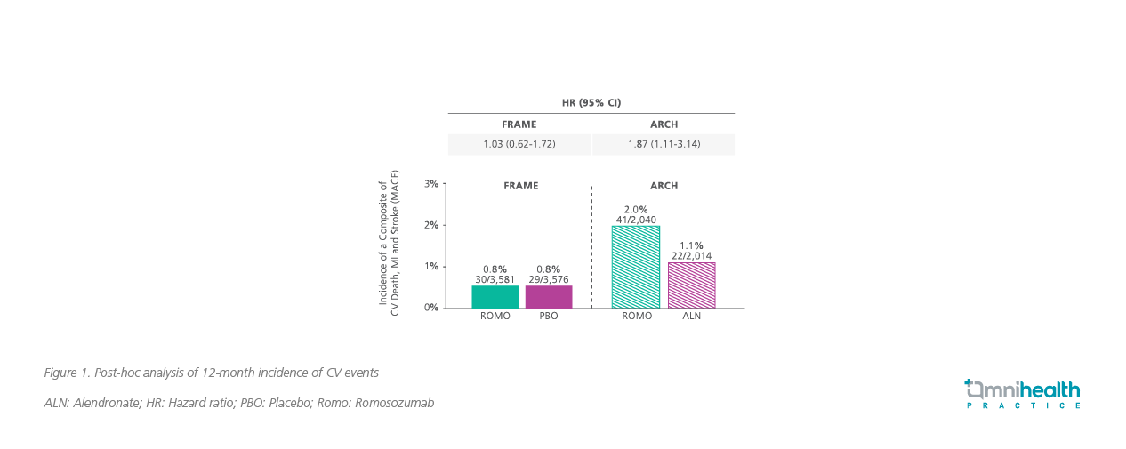Whereas the incidence of the composite of CV death, myocardial infarction (MI) and stroke in the first year was identical between the romosozumab and the placebo arms in the FRAME study (HR=1.03; 95% CI: 0.62-1.72), a higher incidence was observed among patients in the romosozumab group in the ARCH study (HR=1.87; 95% CI: 1.11-3.14) (Figure 1).5 Notably, both the FRAME and ARCH studies included elderly patients (55-90 years of age) with those having high-risk CV disease not excluded from the baseline population.2,3 As such, during the first 12 months of the ARCH study, 50 of 2,047 (2.5%) patients in the romosozumab group compared with 38 of 2,046 (1.9%) in the alendronate group have experienced serious CV events, primarily MI and stroke.3
