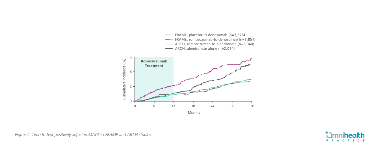 During the first 12 months of the ARCH study, the incidence of MACE reported in the romosozumab arm was doubled as compared to the alendronate arm.5 These higher CV outcomes were exclusively found in the ARCH study which may be attributed to the ARCH population having a higher prevalence of baseline CV risk factors than the FRAME population. Indeed, patients in ARCH were older, had more prevalent hypertension, cerebrovascular conditions, ischemic heart disease, heart failure, and atrial fibrillation.5