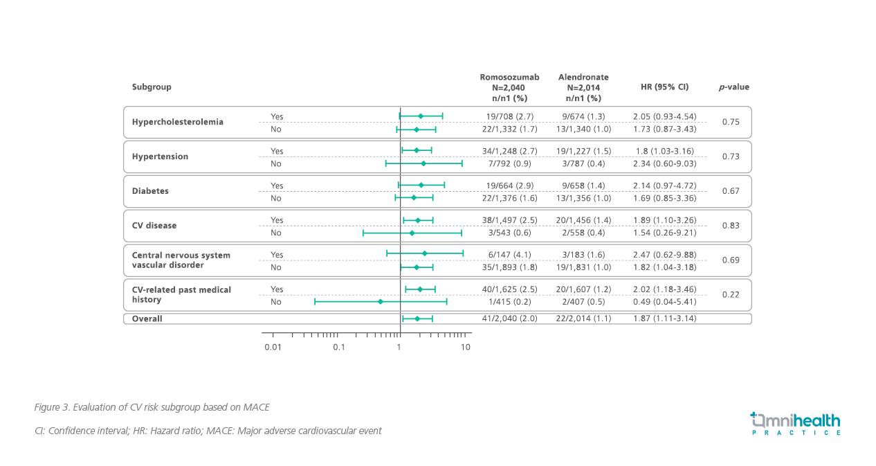 In the subsequent subgroup analysis of the FRAME and ARCH studies, the relative risk of CV events was generally consistent in the 12-month period between the romosozumab and control groups.5 Particularly in the ARCH study, no specific CV risk factor such as age, smoking history or prior history of MI and stroke, was found to be associated with an increased relative risk of MACE among patients receiving romosozumab versus patients receiving alendronate (Figure 3).5