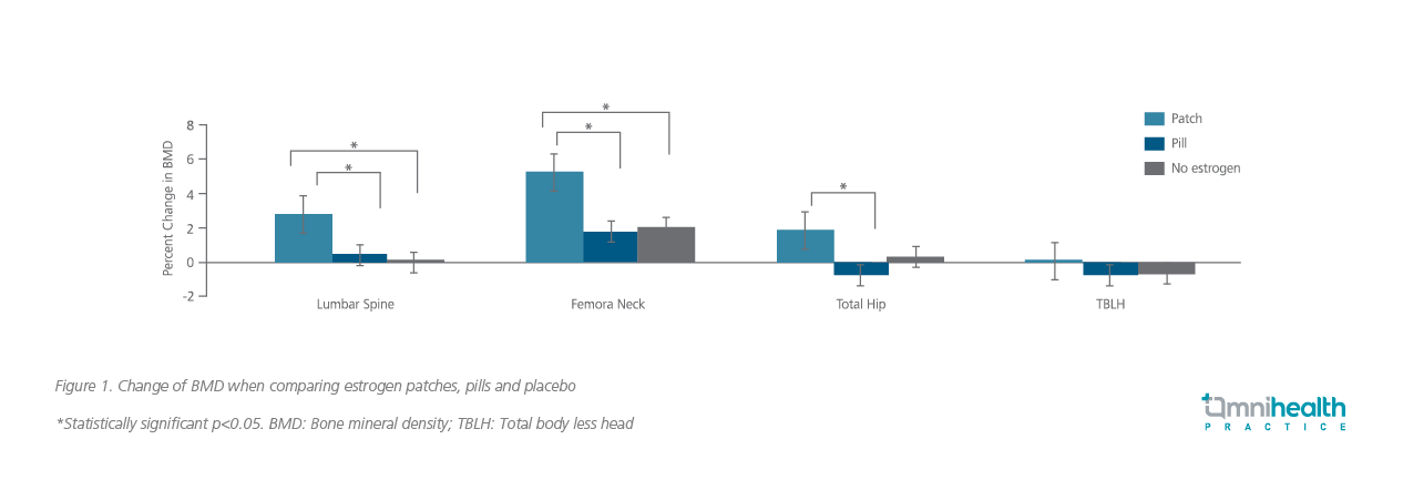 To evaluate the effectiveness of transdermal estrogen patches, a three-arm clinical trial comparing transdermal patch estrogen versus oral estrogen versus placebo showed that the greatest increase of BMD in the lumbar spine, femoral neck and total hip in the group receiving estrogen patch (Figure 1).4 In addition, the patch group had the greatest increase in tibial trabecular number and trabecular volumetric BMD.4 In another 18-month randomized control trial comparing estradiol patch versus oral medroxyprogesterone, a significant increase in spinal and hip BMD was observed with transdermal estradiol replacement plus cyclic oral progestin among AN patients aged 12 to 18-years-old.5 With both studies supporting the effectiveness of transdermal estrogen in improving BMD among women with AN, Prof. Misra concluded, “The [estrogen] patch but not the pill is effective in improving bone outcomes.”