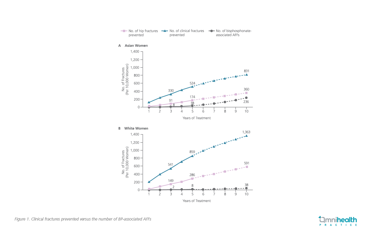 When considering the benefit of fracture prevention treatment, the use of BP was associated with the prevention of 149 hip fractures for every 2 BP-associated AFFs in Caucasians and 91 hip fractures for every 8 BP-associated AFFs in Asian women (Figure 1).4 In addition, the discontinuation of BP resulted in a rapid decline in AFF risk.4 Based on these findings, Prof. Black emphasized that the benefit of BP is far greater than the risk that it may incur, and recommended a short drug holiday following every five-year use of BP for the optimal prevention of osteoporotic fracture among postmenopausal women.4