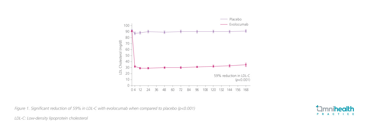 The randomized, double-blind LAPLACE-2 study also showed that the addition of evolocumab to those who continued to receive statin every 2 weeks or monthly further reduced LDL-C by 66%-75% and 63%-75%, respectively, by 12 weeks of treatment that was significantly better than both the ezetimibe or placebo (p<0.001).15 Notably, evolocumab showed added benefit among patients who received moderate- and even high-intensity statins with the lipid-lowering benefit extended to non-high-density lipoprotein cholesterol, apolipoprotein B and lipoprotein.15 Similar to the FOURIER study, evolocumab showed comparable rates of adverse events to ezetimibe and placebo in LAPLACE-2, indicating that evolocumab is a safe and effective approach to lower LDL-C when statins are not optimal.15