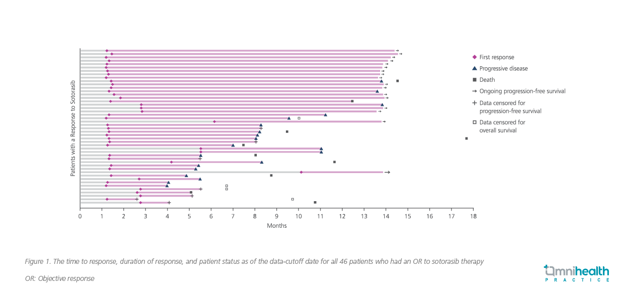 Following the phase 1 trial, the CodeBreak 100 phase 2, multicenter, single-group, open-label study continued to evaluate the efficacy and safety of once-daily 960mg oral sotorasib in patients with KRASG12C-mutated advanced NSCLC previously treated with standard therapies.24 The study recruited 126 patients, of which 81.0% had previously received both platinum-based chemotherapy and PD-1 inhibitors.24