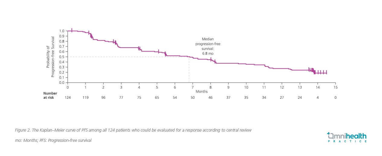 The results revealed that, of the 124 patients evaluated for response, 46 patients had an objective response (OR; 37.1%; 95% CI: 28.6-46.2), where 4 patients (3.2%) achieved complete response and 42 patients (33.9%) achieved partial response.24 Notably, disease control was achieved by 80.6% (95% Cl: 72.6-87.2) of patients.24 Tumor shrinkage of any magnitude was observed in 82.3% of patients (102/124). Median best percentage decrease from baseline in tumor burden was 60%.24