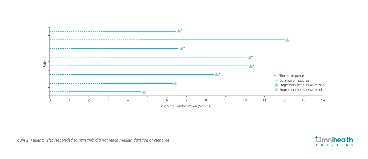 As GISTs continue to progress after multiple lines of treatment, many tumors will acquire different patterns of resistance and become difficult to treat. At this stage, tumor shrinkage is rarely observed even when adequate treatment is given. As such, the treatment goal for patients failing imatinib, sunitinib and regorafenib should be targeted towards stable disease which can significantly contribute to long-term survival benefit. In the INVICTUS study, 66% of patients achieved stable disease at 6 weeks with ripretinib versus 21% of patients receiving placebo.3 Notably, this benefit was maintained at 12 weeks with 47% of patients on ripretinib remaining in stable disease versus 5% in those receiving placebo, supporting the benefit of ripretinib in patients who failed multiple lines of treatment.3