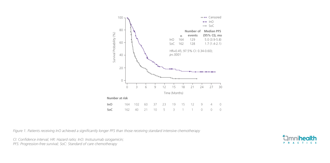 In the survival analysis, InO significantly improved median PFS (5.0 vs. 1.7 months; HR=0.45; pone-sided<0.0001; Figure 1) and median OS (7.7 vs. 6.2 months; HR=0.75; pone-sided=0.0105) with the survival benefit remaining consistent regardless of the presence of Ph-positive or t(4;11) mutations.5 With improved CR/CRi and MRD-negative rates, nearly 4 times more patients proceeded directly to allo-SCT after InO (39.6% vs. 10.5%; pone-sided<0.0001).5 Even after allo-SCT, InO continued to demonstrate a trend in survival benefit with a lower cumulative incidence rate of relapse (28.6% vs. 45.7%; subdistribution HR=0.65; 97.5% CI: 0.34-1.24; p=0.18) and improved OS (41.4% vs. 34.1%; subdistribution HR=1.26; 97.5% CI: 0.66-2.41; p=0.78) at 24 months post-transplant when compared to standard chemotherapy.8