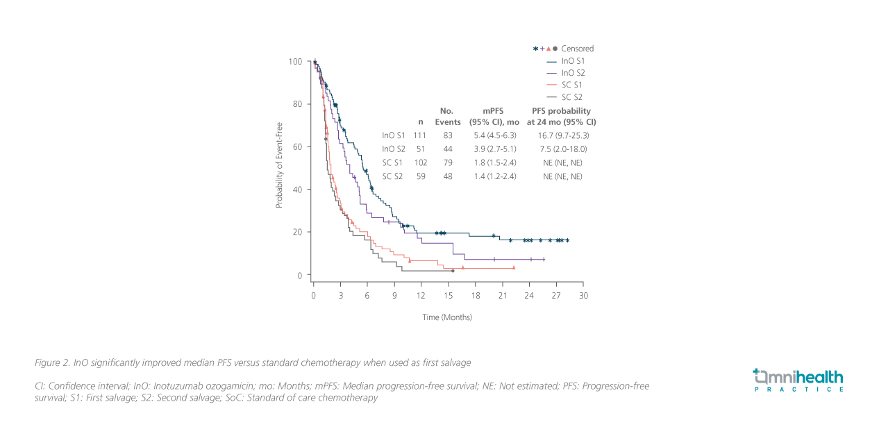 Although the R/R ALL patient in the shared case was not suitable for allo-SCT due to her old age, InO was able to maintain control of her disease for 2 months even after numerous lines of prior treatments. Where InO was given in the later lines of treatment in the shared case, based on the in-depth analysis of the INOVATE study, patients receiving InO achieved higher rates of CR/CRi than standard chemotherapy regardless of salvage stage but the benefit was more pronounced in first savage (Salvage 1: 78.4% vs. 28.4%; p<0.0001; Salvage 2: 64.7% vs. 35.6%; p=0.0012).10 When considering survival benefit, patients receiving InO as first salvage also derived greater benefit in median PFS (5.4 vs. 1.8 months; HR=0.44; 97.5% CI: 0.31-0.64; p<0.0001) than second salvage (3.9 vs. 1.4 months; HR=0.49; 97.5% CI: 0.30-0.81; p=0.0006) when compared to chemotherapy, supporting the use of novel therapies in earlier lines of R/R ALL treatment to bridge towards allo-SCT (Figure 2).10