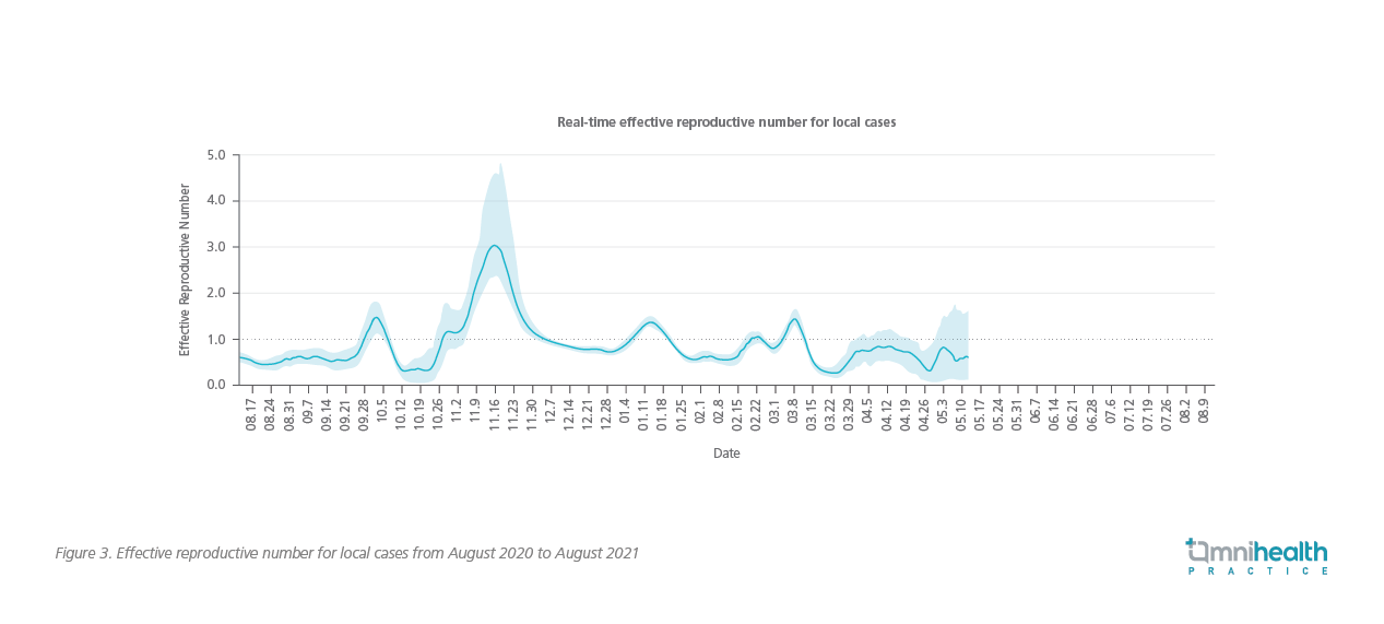 Besides, potential challenges still exist in controlling future disease transmission. Regarding the overwhelming situation of infection with the Delta variant of SARS-CoV-2 (B.1.617.2),11 it is believed that the current measures may not be sufficient to control the transmission. It is because when the fourth wave of COVID-19 outbreak (which arrived in late November 202012) nearly subsided in December 2020, the reproductive number for local cases reached only to a satisfactory level at 0.9 (Figure 3),13 suggesting that the same measures may not be sufficient when countering the fifth wave of virus, particularly under the threat of more contagious Delta variant. It is hoped that a higher vaccination coverage could help alleviate the spread of disease in the coming waves of virus, while stricter measures may still be required.
