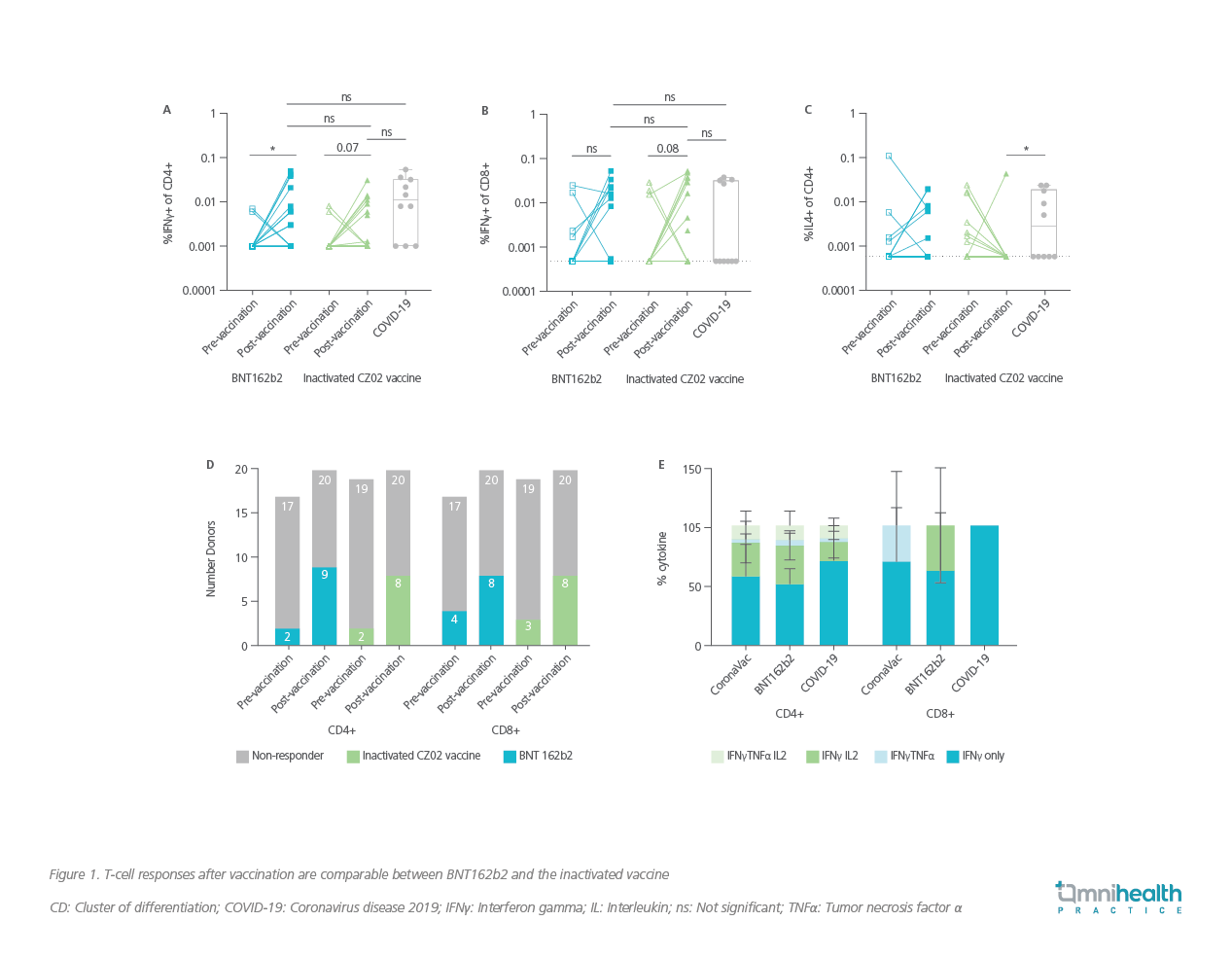 In terms of vaccine effectiveness, both vaccines induce similar protection against SARS-CoV-2 through T-cell immunity.8 In a comparative data on the immunogenicity of BNT162b2 vaccine (n=20) and the inactivated vaccine (n=20), both vaccines induced comparable cluster of differentiation (CD) 4 and CD8 T-cell responses to spike proteins at 1 month post 2-dose vaccination (Figure 1A, 1B, 1C), proportions of subjects that had detectable post-vaccination T-cell responses (Figure 1D), and post-vaccination production levels of polyfunctional cytokines by T-cells in vaccine responders (Figure 1E).8 Since T-cell responses are likely to be crucial to controlling the severe and fatal outcomes, the two vaccines are proposed to be both effective in preventing such adverse outcomes of SARS-CoV-2 infection.8