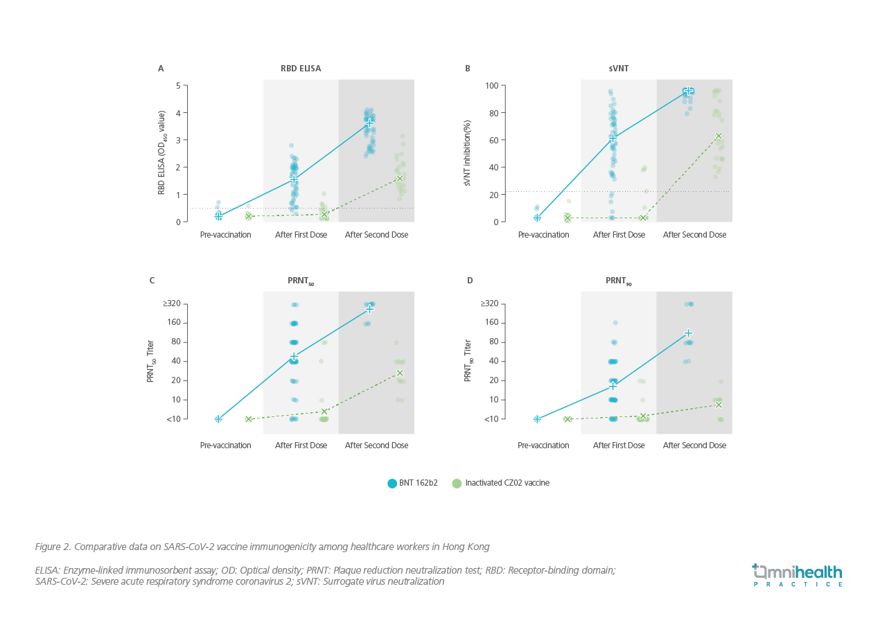 However, the two vaccines seem to induce different levels of prevention against viral infection as different concentrations of neutralizing antibodies were observed in the study.8 Results found that higher levels of SARS-CoV-2 specific binding and neutralizing antibody responses [in plaque reduction neutralization test (PRNT)50, PRNT90, surrogate virus neutralization (sVNT), spike receptor binding (RBD), spike N terminal domain (NTD) binding, and spike S2 domain binding antibody levels] were observed with the BNT162b2 vaccine (n=49) compared with the inactivated vaccine (n=49).8