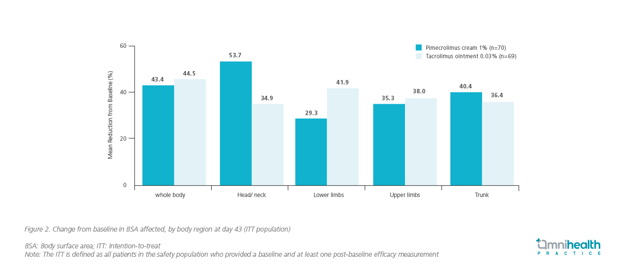 Both pimecrolimus cream 1% and tacrolimus ointment 0.03% are indicated for moderate AD. A study evaluating these 2 preparations showed similar overall efficacy and safety in paediatric patients with moderate AD.7 However, pimecrolimus cream 1% tended to achieve a better clinical outcome in the head and neck skin areas than tacrolimus ointment 0.03% (Figure 2).7 In addition, patients had higher acceptance of pimecrolimus cream 1% due to its less occlusive formulation.7 Since it is usually hot and humid during the summers in Hong Kong, the occlusive ointment preparation will not only render patients feel uncomfortable, trapping excess heat and sweat on the skin could also exacerbate the condition of AD.2 The less occlusive, non-sticky feel, and ease of rub-in features of pimecrolimus cream 1% are beneficial in the hot and humid climate of Hong Kong.2 “Pimecrolimus cream 1% is generally preferred by patients who dislike greasy preparations,” Prof. Hon added.