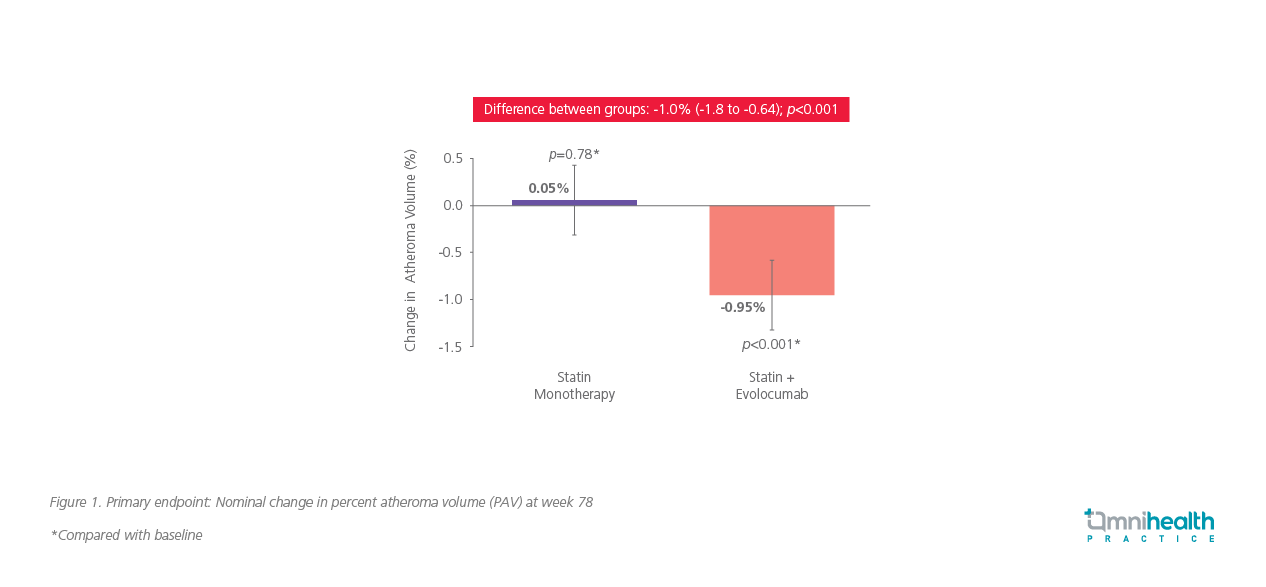A post-hoc analysis of the study revealed that patients with baseline LDL-C levels <1.81mmol/L would have a more favorable effect on the change in PAV with the evolocumab treatment (-1.97% vs. -0.35% in the placebo group).14 The between-group difference was -1.62% (95% CI: -2.5%-0.74%; p<0.001).14