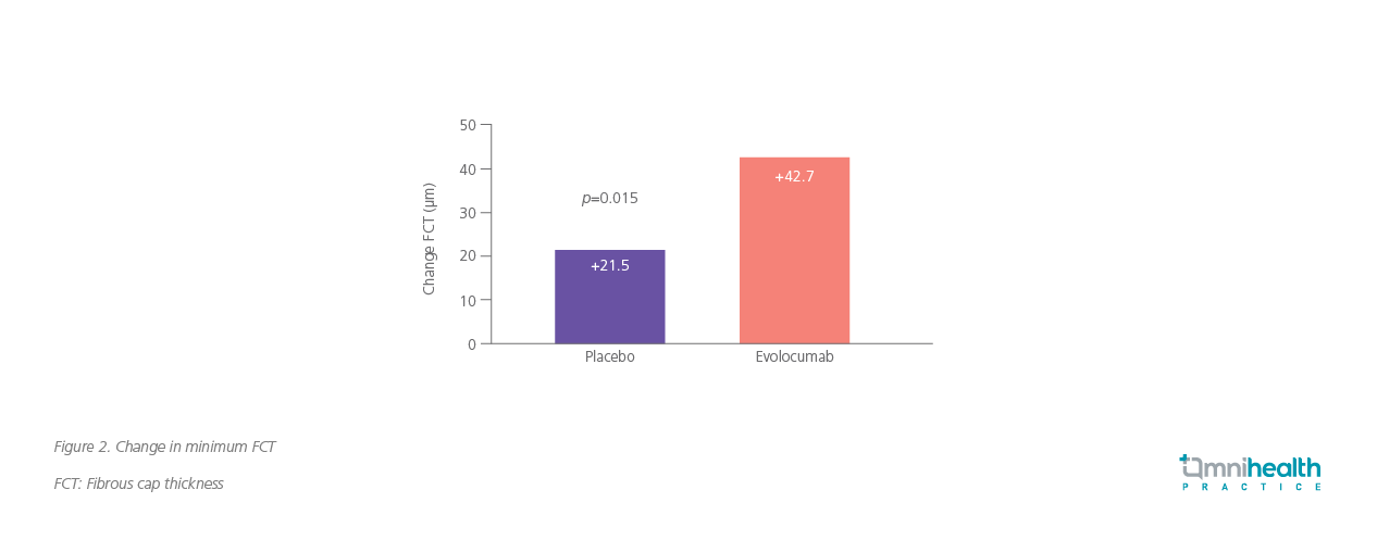 After 50-weeks treatment, evolocumab group achieved a significantly lower LDL-C level of 0.73mmol/L from 3.63mmol/L, compared with 2.25mmol/L attained by the statin plus placebo group from 3.67mmol/L.13 The minimum FCT was increased by 42.7µm in the evolocumab group, while the increase was only 21.5µm in the statin plus placebo group (p=0.015) (Figure 2).15