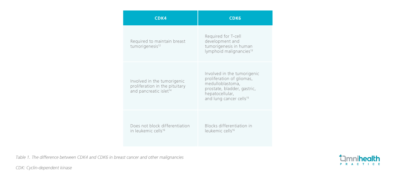 CDK4-associated kinase activity is required to maintain breast tumorigenesis and CDK6 is a critical requirement for T-cell development and tumorigenesis among human lymphoid malignancies (Table 1).12,13 Through a combination approach, CDK4&6 inhibitors can enhance the effectiveness of endocrine therapy and improve the PFS and ORR of ABC patients both as initial therapy and after progression on endocrine therapy, supporting their use across ABC patients regardless of their underlying risk factors.8