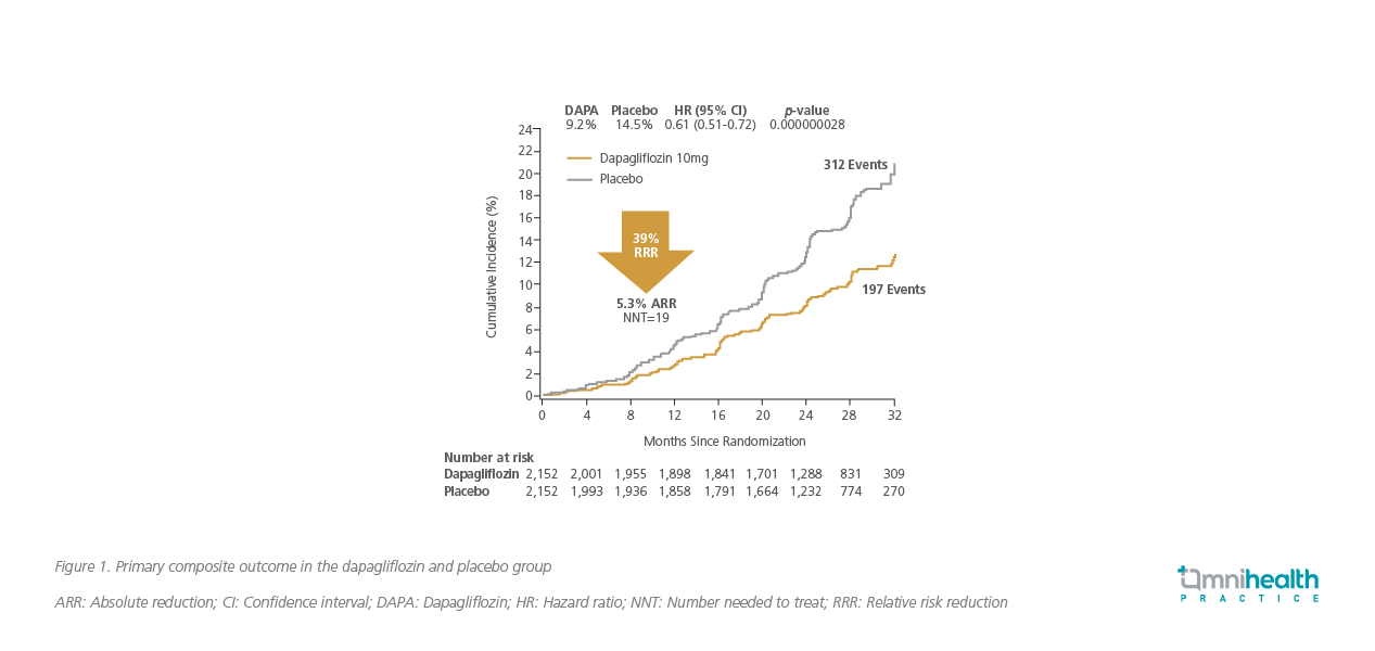 Among all participants, 67.5% (2,906 of 4,304) of them had T2DM, and 10.9% had baseline heart failure (HF).8 They were then randomized 1:1 to receive dapagliflozin 10mg once daily and placebo until the first occurrence of any of the following events:8