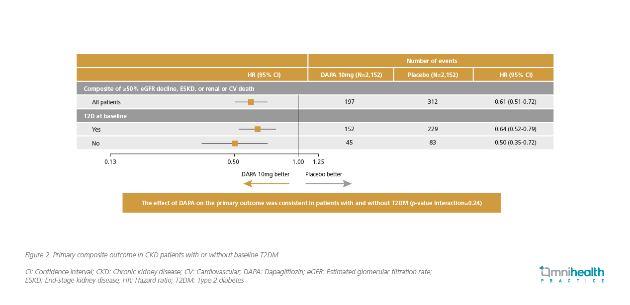 After a median follow-up of 2.4 years, the results were encouraging.8 Dapagliflozin demonstrated a 39% relative risk reduction in the primary composite endpoint (Defined as a sustained ≥50% decline in eGFR, ESKD, renal or CV deaths) compared to placebo (HR=0.61; 95% CI: 0.51-0.72, p<0.001).8 These major events occurred in 9.2% of patients in the dapagliflozin group compared with 14.5% in the placebo group (Figure 1).8 A further analysis revealed that dapagliflozin’s efficacy was consistent in patients with or without T2DM (HR=0.64; 95% CI: 0.52-0.79 vs. HR=0.50; 95% CI: 0.35-0.72, p=0.24) (Figure 2).8 For patients with baseline HF, a prespecified subgroup analysis showed that dapagliflozin reduced their risk of the primary outcome by 42%, which was comparable to those without baseline HF [HR=0.58 (95% CI: 0.37-0.91) vs. HR=0.62 (95% CI: 0.51-0.75), p=0.59].12