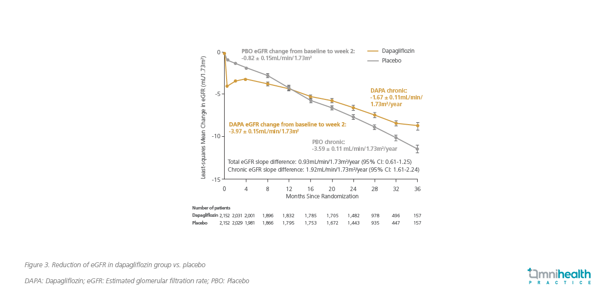 On the other hand, dapagliflozin also demonstrated a significantly slower decline in eGFR than the placebo group with a between-group difference of 1.92mL/min/1.73m2/year (Figure 3), verifying the prominent kidney-preserving effect of this SGLT2 inhibitor.8