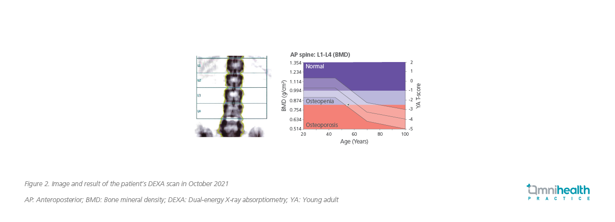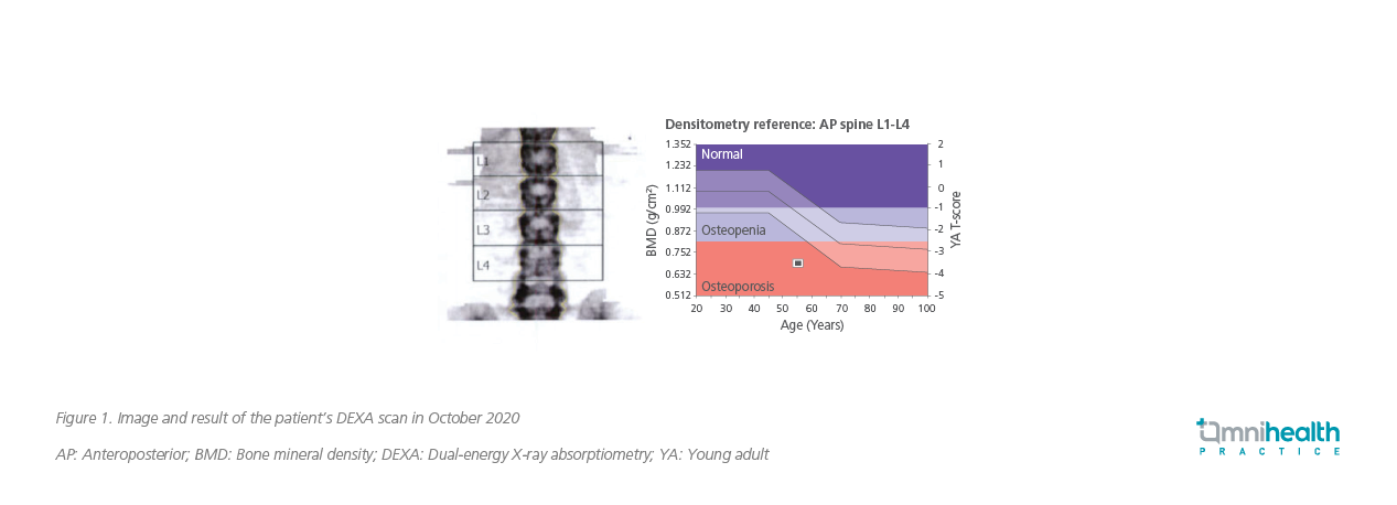 In 2018, a 56-year-old asymptomatic postmenopausal woman was diagnosed with osteoporosis in lumbar spine with an average L1-L4 bone mineral density (BMD) of 3.1 standard deviations below young adult female (i.e. T-score=-3.1). The finding suggested mildly to highly increased risk of minimal trauma fracture. However, anti-osteoporotic treatment was not initiated, and her condition kept deteriorating. The average T-score was reduced to -3.3 a year later. In October 2020, her T-score was further lowered to -3.5, indicating an even higher risk of fracture at the lumbar spine (Figure 1). After discussion with the patient of the potential consequences, she accepted pharmacological treatment. Since the patient preferred a more convenient regimen and did not have any medical history of stroke or other cardiovascular diseases, she started on romosozumab therapy with a monthly subcutaneous injection for 12 months. DEXA scans were performed at month 6 and month 12 to monitor her treatment response.