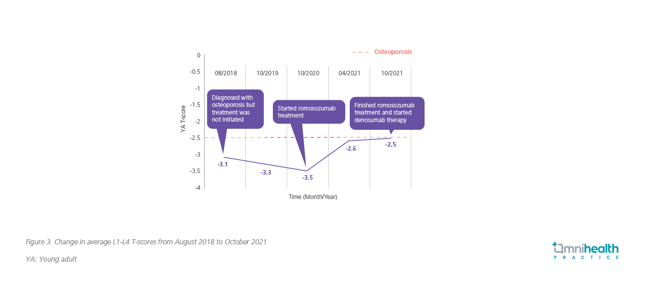 Overall, this patient responded well to romosozumab treatment which increased her average L1-4 BMD from 0.689g/cm2 to 0.818g/cm2 and her average T-score from -3.5 to -2.5 in 12 months (Figure 3). Given the importance of the use of antiresorptive agents to consolidate the BMD gains from the bone-forming agent, the patient continued with 6-monthly denosumab treatment after she had completed the 12-month romosozumab therapy.