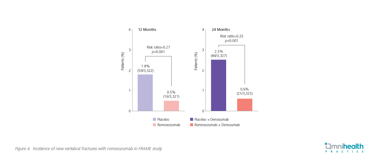 This benefit was further proven in the 36-month extension study of FRAME, in which the relative risk reduction of new vertebral, clinical and nonvertebral fracture was 66%, 27% and 21% respectively in the romosozumab-to-denosumab group compared with placebo-to-denosumab group. BMD continued to increase for 2 years with denosumab treatment in both arms.13