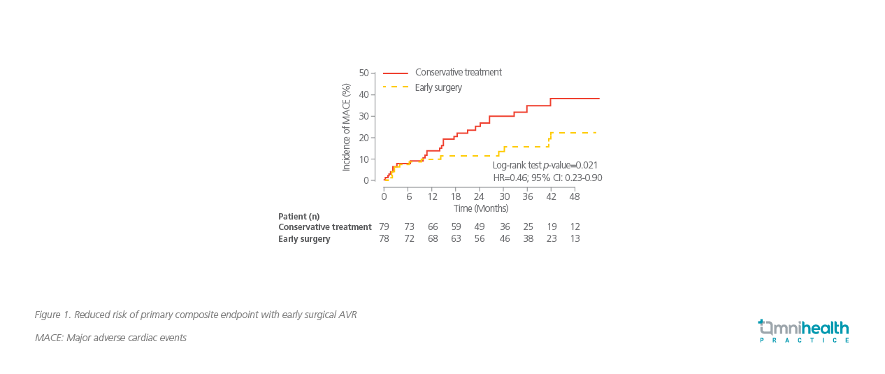 A significantly lower rate of the secondary endpoints in terms of all-cause mortality (HR=0.56; 95% CI: 0.214-1.27; log-rank p=0.16) and heart failure hospitalization (HR=0.32; 95% CI: 0.18-1.19; log-rank p=0.075) was observed in surgical AVR arm versus conservative treatment arm.2 There were no significant differences between the two arms among other secondary endpoints, which included repeated major adverse CV events [3.8% vs. 8.9%; odds ratio (OR)=0.41; 95% CI: 0.1-1.65], thromboembolic complications (2.6% vs. 2.3%; OR=1.03; 95% CI: 0.14-7.67) and major bleeding (5.1% vs. 1.3%; OR=3.52; 95% CI: 0.37-32.68).2 The rate of operative mortality in the early surgery group was 1.4% (One patient).1 Therefore, early surgical AVR in asymptomatic patients with severe AS seems to provide better clinical outcomes as compared to the conservative treatment.1