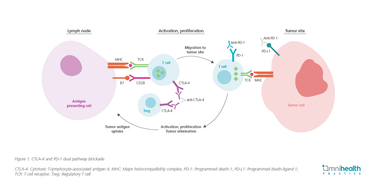The cytotoxic T-lymphocyte-associated antigen 4 (CTLA-4) and PD-1 are the key immune checkpoints that inhibit T cell functions.9 CTLA-4 regulates the proliferation of T cells early in the lymph nodes, whereas PD-1 suppresses T cells later in the peripheral tissues (e.g. tumor sites).9 Since tumor cells are capable of developing ways to evade the host immune system by taking advantage of these immune checkpoints, simultaneous inhibition of CTLA-4 and PD-1 (i.e. dual pathway blockade) was believed to have a synergistic effect in obtaining a larger and longer-lasting antitumor immune response (figure 1).9
