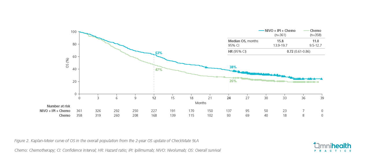 NIVO + IPI is the first approved dual immunotherapy for the treatment of advanced NSCLC. The long-term survival benefits of NIVO + IPI with or without chemotherapy in patients with stage IV or recurrent NSCLC were shown in CheckMate 9LA and CheckMate 227, respectively.5,10 With a median follow-up of 54.8 months in CheckMate 227, 29% of patients with PD-L1 ≥1% on NIVO + IPI remained alive at 4 years vs. 18% with with the chemotherapy arm.10 Among patients with PD-L1 <1%, 24% were alive at 4 years with NIVO + IPI vs. 10% with chemotherapy alone.10 In CheckMate 9LA (median follow-up: 30.7 months), the median OS of patients on NIVO + IPI with chemotherapy was 15.8 months vs. 11.0 months with chemotherapy alone (HR=0.72; 95% CI: 0.61-0.86) (figure 2).5 The 2-year OS rate was 38% with the triplet therapy vs. 26% with chemotherapy.5 Both trials achieved good long-term survival curves which plateaued out and were maintained over time.5,10