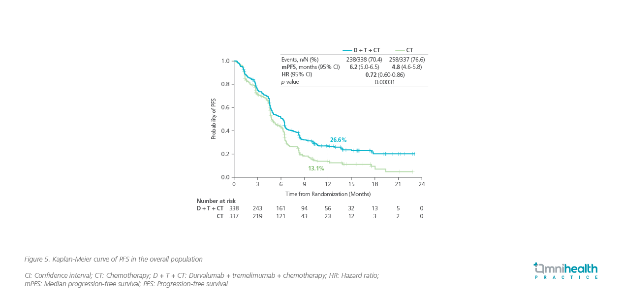 Consistent survival benefits were observed in patients treated with D + T + CT in POSEIDON, regardless of tumor PD-L1 expression level.7 With a median follow-up of 34.9 months, patients on the triplet therapy group achieved a significantly longer median OS of 14.0 months vs. 11.7 months in the chemotherapy group (HR=0.77; 95% CI: 0.65-0.92; p<0.00304) (figure 4).7 Similar to CheckMate 227 and CheckMate 9LA, the tail of the survival curve in POSEIDON began to separate and plateaued out over time.7 The risk reductions in overall mortality by D + T + CT among patients with PD-L1 <1% and ≥1% were similar (HR=0.77 vs. 0.76).7 The median PFS by the BICR was also significantly longer with the triple therapy arm compared with chemotherapy alone [6.2 months vs. 4.8 months (HR=0.72; 95% CI: 0.60-0.86; p<0.00031)] (figure 5).7