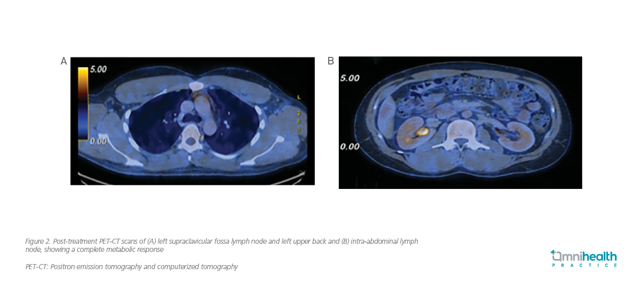 The patient completed his 6th cycle of BV-CHP treatment in November 2019 with remarkable clinical outcomes. All his blood and biochemical parameters had returned to the normal range. The PET-CT scans were obtained again after completion of the treatment course. All previously hypermetabolic lymphadenopathies in cervical, thoracic, abdominal, and pelvic regions had either normalized or resolved (figure 2). No more hypermetabolic lymphadenopathy or lesion suggestive of lymphomatous disease was detected.