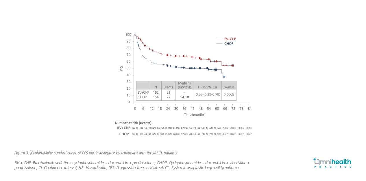 The global approvals and international recommendations of the BV-CHP regimen as a frontline therapy for ACLC patients were based on its clinical efficacy demonstrated in the double-blind, randomized, phase 3 ECHELON-2 study, which aimed to compare PFS achieved by the BV-CHP and the standard CHOP regimens among patients with previously untreated CD30-positive PTCL in 1:1 randomization.6 In this study, a total of 452 patients were enrolled, with 70% of the patients (n=316) diagnosed with sALCL. Among the ALCL patients, 48% had ALK-negative subtype (n=218) and 22% had ALK-positive (n=98).6 In addition, most of the included patients had advanced disease (stage III: 27%; stage IV: 53%) and poor prognosis (International Prognostic Index ≥2: 78%) at baseline.6